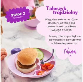 Talerz Nana's Manners został stworzony dla dzieci, które rozpoczynają ekscytującą przygodę samodzielnego jedzenia! Idealnie dopasowany do małych posiłków. Talerzyk Nanas posiada trzy sekcje, przegródki, dzięki którym dziecko samo decyduje co będzie mieszać czy maczać według swoich potrzeb. Wydłużony przód pomaga wrócić niesfornemu jedzeniu na talerzyk :)